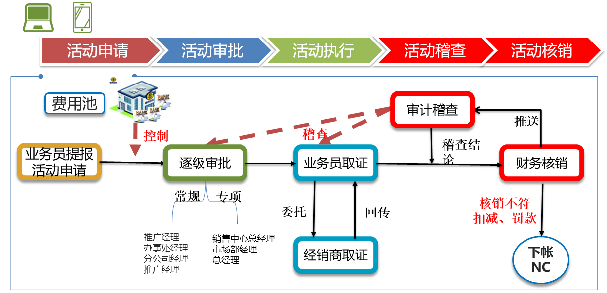 通過(guò)流程自定義配置,自定義拖拽實(shí)現活動(dòng)流程的管控,實(shí)現活動(dòng)、費用、終端三大模塊審批精準管控。 系統包含移動(dòng)端和PC端,PC采用桌面客戶(hù)端方式自動(dòng)化更新,移動(dòng)端用于用戶(hù)的實(shí)地取證及便捷審批。移動(dòng)端包含公司用戶(hù)入口和專(zhuān)業(yè)商的入口,支持經(jīng)銷(xiāo)商和公司用戶(hù)協(xié)同作業(yè)。 三模塊包含費用模塊、活動(dòng)模塊和終端模塊。費用模塊對接其他系統獲取銷(xiāo)售訂單,通過(guò)自定義配置每一類(lèi)產(chǎn)品每一類(lèi)銷(xiāo)售訂單的計提邏輯為活動(dòng)模塊提供經(jīng)費?;顒?dòng)模塊通過(guò)30種活動(dòng)的取證審批下賬實(shí)現經(jīng)銷(xiāo)商的信用評分計算。終端模塊用來(lái)處理核心終端的進(jìn)貨采集及費用提點(diǎn)等。